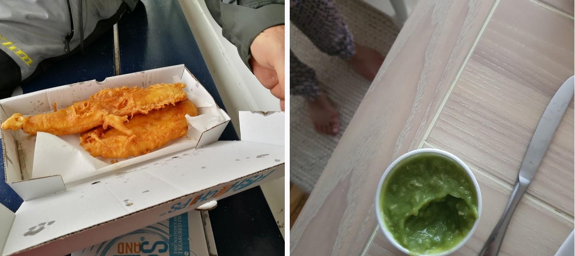 My best fish and chips ever. This is a takeaway chippy with some seating outside across the road from the beachfront.